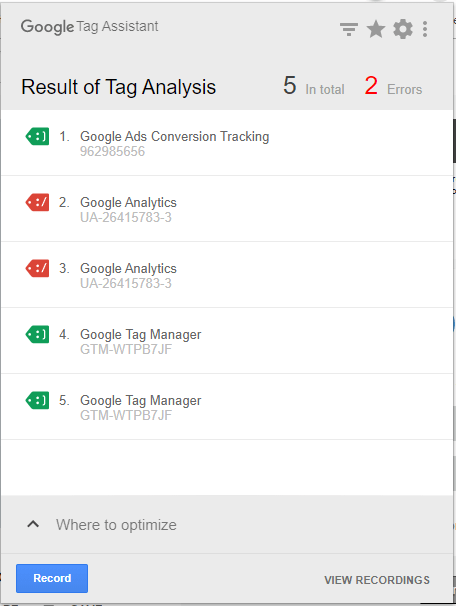 The Google tag assistant will help you to identify the various Google analytics tag used on the website. The Google tag assistant will check for any errors, report back to the user, and give suggestions on the improvements required such as Google Analytics, Adwords Conversion Tracking, Google Tag Manager, Global Site Tag, and more. Use the Google tag assistant to diagnose troubleshoot or validate all the Google Analytics implementations.
