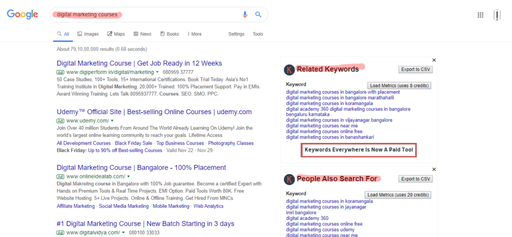 Most popular SEO tool plugin for finding keywords with just a click. It helps you to populate “related keywords” and “people also search for” along with the search word you have used on a search engine. The tool comes with features like bookmarking favorite keywords, importing those keywords, page analysis, stats, and other metrics. You need to signup and get an API key emailed to you from the creators to activate this plugin. From October 1st, 2019, it was made a paid tool to keep the platform running. If you can afford to spend a few dollars., it’s worth going for.