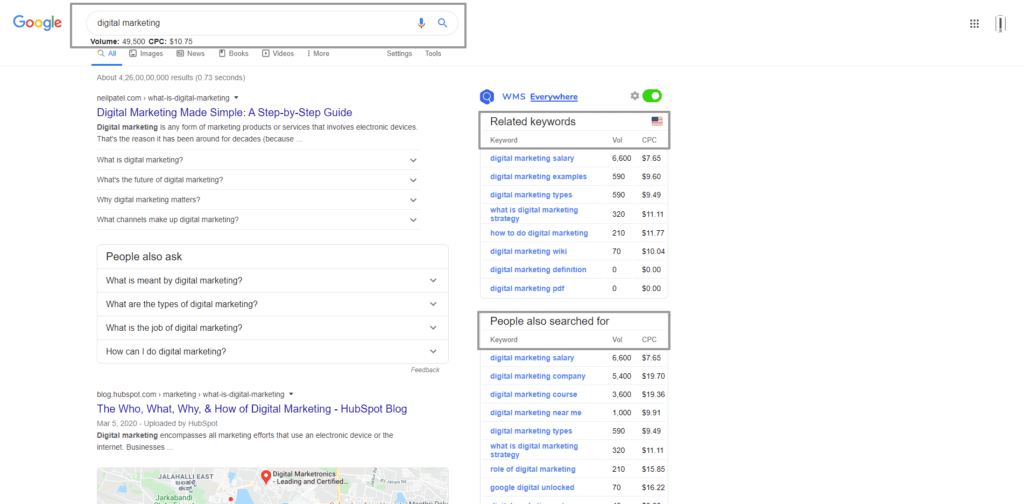 It also provides monthly search volume and search volume CPC competition data right under the Google search bar for the Googled phrase.