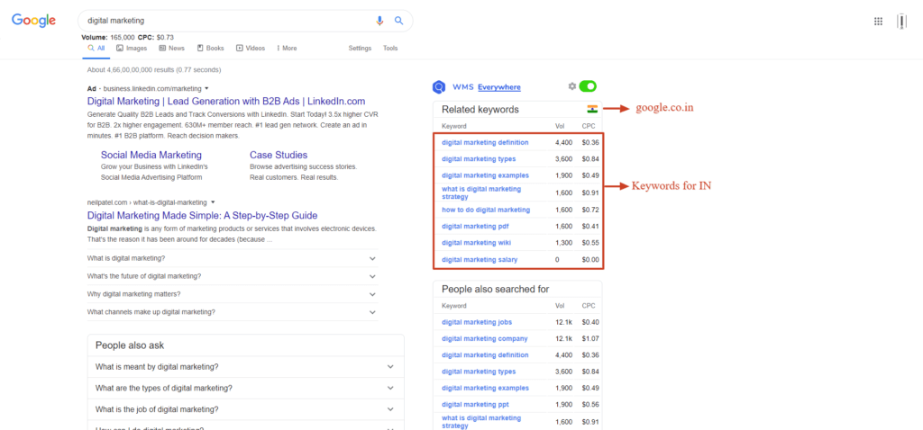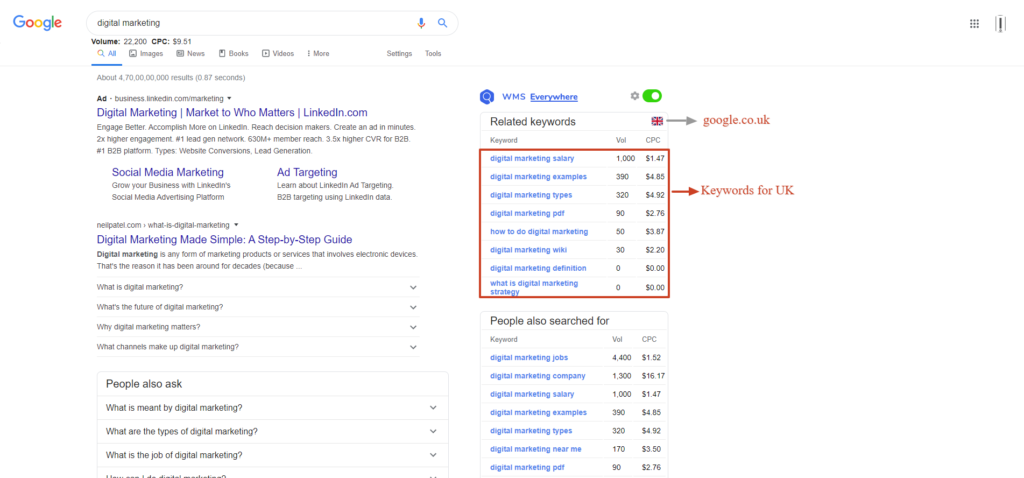 In the example below, you can see the difference in the result for the keyword “digital marketing” for the United Kingdom and India. The results are fetched from google.co.uk and google.co.in respectively. The auto-detect feature does a fair job of getting you the result from google.com.